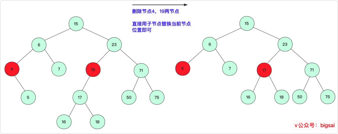 此种情况也很容易,直接将删除点的子节点放到被删除位置即可。
