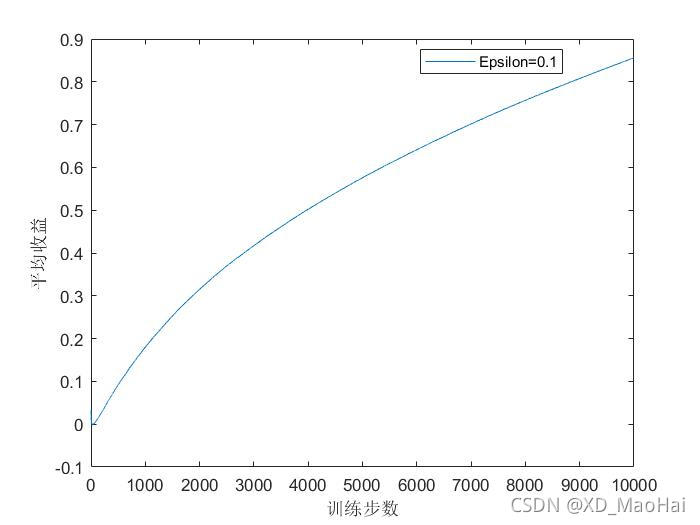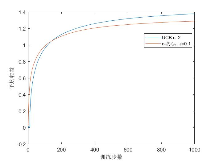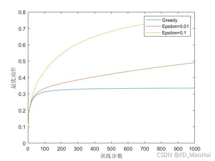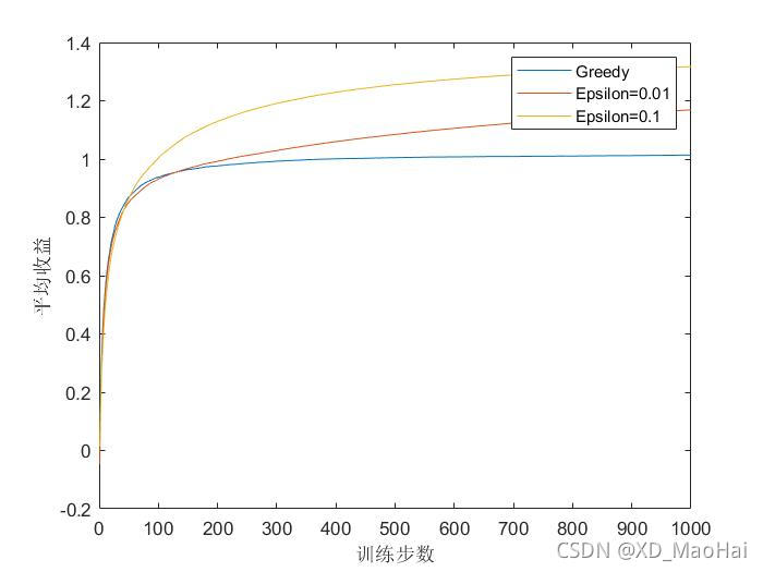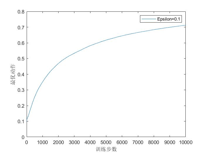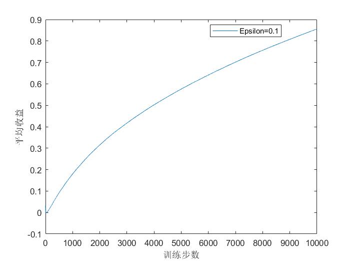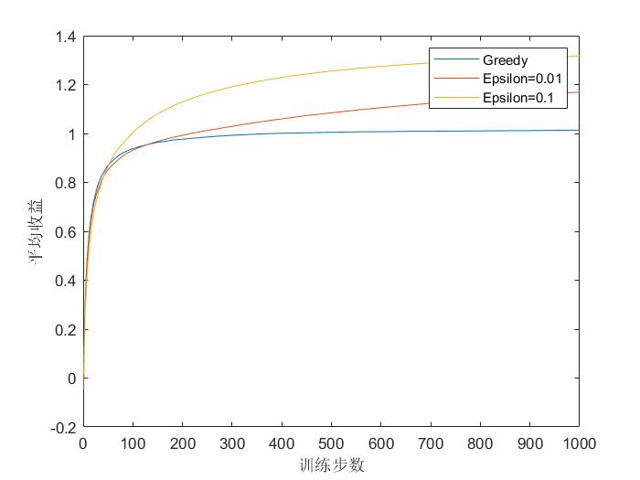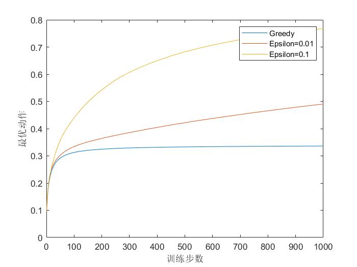 for epsilon = Epsilonreward_total_set = zeros(1,TrialN); %存放全局总平均收益的数组reward_set = zeros(1,TrialN); %存放单次训练平均收益的数组OpAction_set = zeros(1,TrialN); %存放单次训练最优动作比率的数组OpAction_total_set = zeros(1,TrialN);%存放全局最优动作比率的数组for m = 1:LearnN Value = randn([1 ArmN]); %根据单位正态分布产生各动作的收益期望OpAction = 0; %最优动作比率初始化reward_total = 0; %平均收益[Value_max,Value_max_a] = max(Value);%选出最优动作Q = zeros(1,ArmN); %各动作估计收益初始化N = zeros(1,ArmN); %各动作选择次数初始化for n = 1:TrialN %开始单次学习训练 [Qmax,i] = max(Q); %根据估计收益选出最优收益和最优动作if(Qmax~=0 && rand(1)<1-epsilon) %根据epsilon选择是否随机选择动作(至于Qmax~=0——与其选择印象里没有收益的动作,倒不如随机选择赌一波)action = i; %以1-epsilon的概率选择贪婪动作else action = unidrnd(ArmN); %以epsilon随机选择动作endreward = normrnd(Value(action),1); %以均值为Value(action)、方差为1的正态分布产生实际收益N(action) = N(action) + 1; %选择动作的次数自加一Q(action) = Q(action) + (1/N(action)) * (reward - Q(action));%根据选择动作的估计收益reward_total = reward_total + 1/n * (reward-reward_total); %更新平均收益reward_set(n) = reward_total; %填充平均收益数组if (i==Value_max_a) %判断是否为最优动作OpAction = OpAction + 1; endOpAction_set(n) = OpAction; %填充最优动作次数数组endreward_total_set = reward_total_set + 1/m * (reward_set - reward_total_set); %更新全局平均收益数组OpAction_total_set = OpAction_total_set + 1/m * (OpAction_set - OpAction_total_set);%更新最优动作次数数组 end%绘制全局平均收益随训练步数变化的图线figure(1);plot(reward_total_set);hold on;legend('Greedy','Epsilon=0.01','Epsilon=0.1');xlabel('训练步数');ylabel('平均收益');%绘制最优动作比率随训练步数变化的图线figure(2);OpAction_total_set = OpAction_total_set ./ Range;%将次数化为比率plot(OpAction_total_set);hold on;legend('Greedy','Epsilon=0.01','Epsilon=0.1');xlabel('训练步数');ylabel('最优动作');