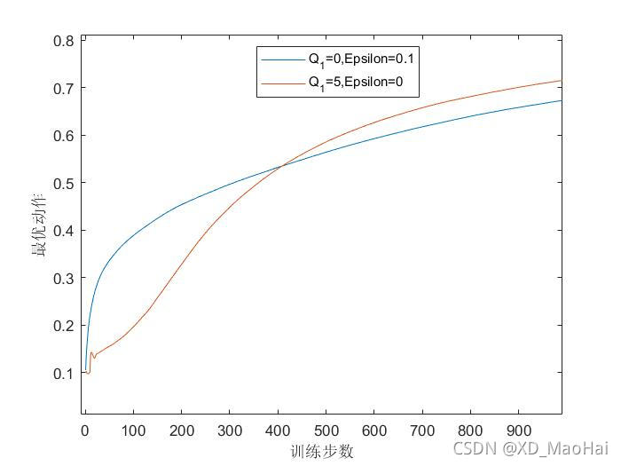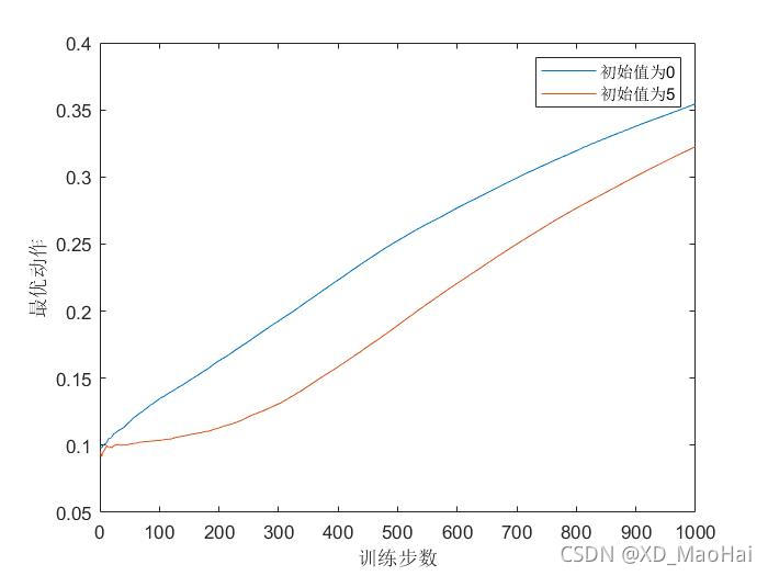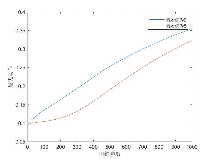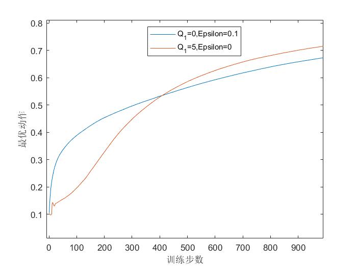 引入一般初始化(初始值为0)ε-贪心算法进行对比,两种方法都采用恒定步长,运行程序可得到结果图如下: