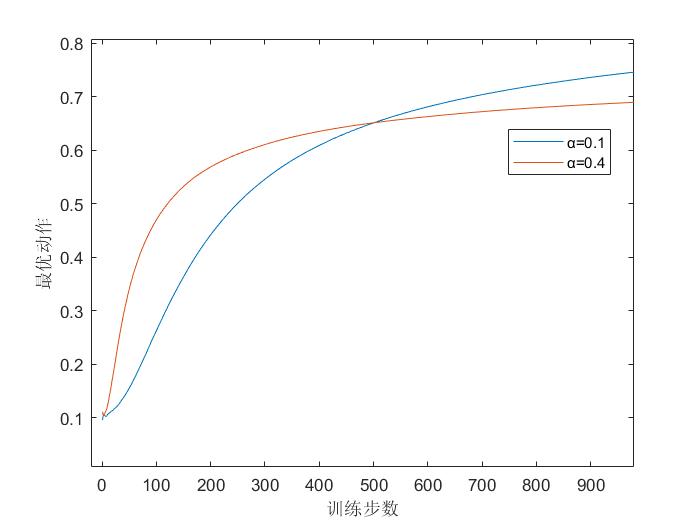 for m = 1:LearnN H = zeros(1,ArmN); %偏好函数reward_total = 0; %平均收益Value = randn([1 ArmN]); %根据单位正态分布产生各动作的收益期望OpAction = 0; %最优动作比率初始化[Value_max,Value_max_a] = max(Value);%选出最优动作Q = zeros(1,ArmN); %各动作估计收益初始化N = zeros(1,ArmN); %各动作选择次数初始化for n = 1:TrialN %开始单次学习训练 [Action_i,Pro] = SelectAct(H); %根据估计收益选出最优收益和最优动作reward = normrnd(Value(Action_i),1); %以均值为Value(action)、方差为1的正态分布产生实际收益reward_total = reward_total + 1/n * (reward-reward_total); %更新平均收益if (Action_i==Value_max_a) %判断是否为最优动作OpAction = OpAction + 1; endOpAction_set(n) = OpAction; %填充最优动作次数数组H = H - alpha*(reward-reward_total)*Pro;H(Action_i) = H(Action_i) + alpha * (reward-reward_total);endOpAction_total_set = OpAction_total_set + 1/m * (OpAction_set - OpAction_total_set);%更新最优动作次数数组