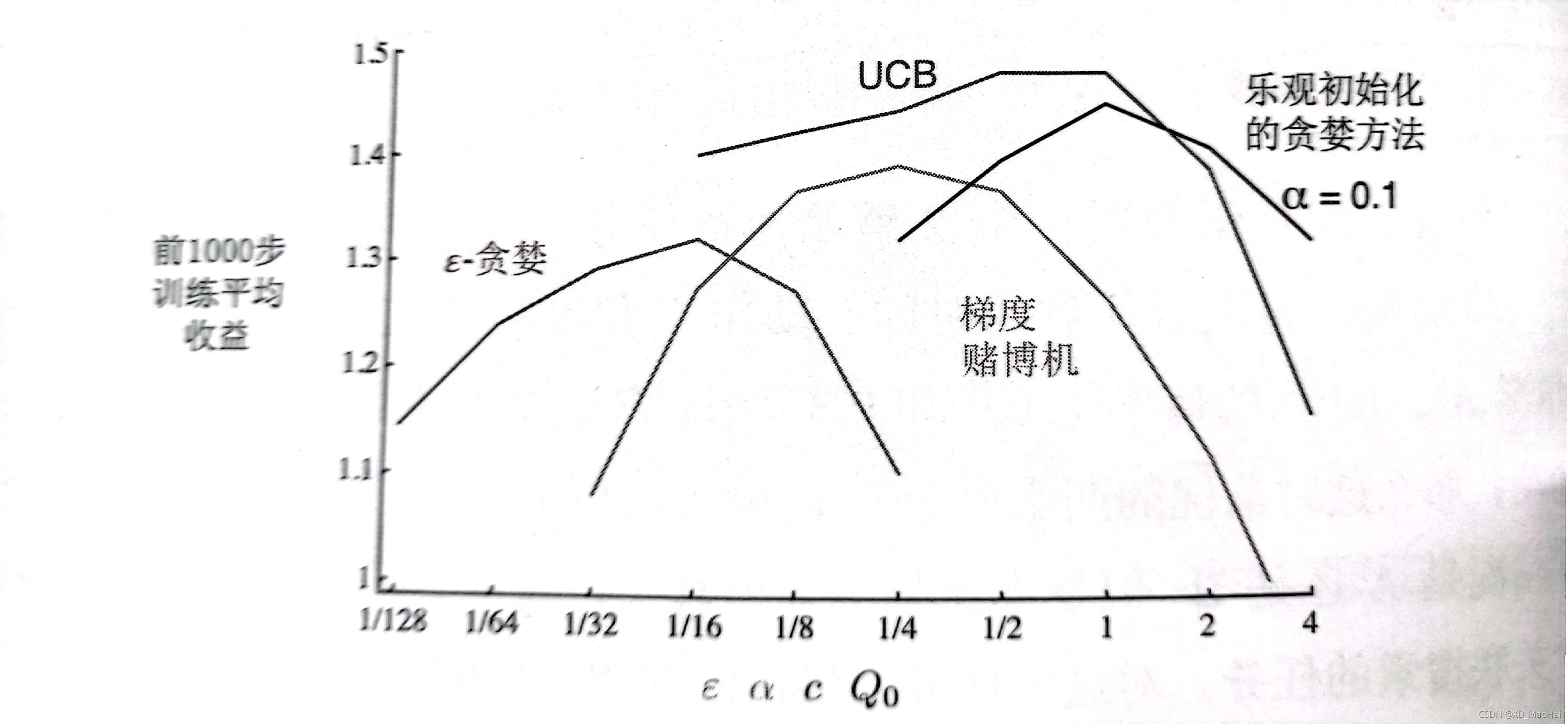 在探究了这么多算法后,为了比较这些算法的优劣,《强化学习》一书将这些算法的学习曲线绘制在了一张图上进行比较: