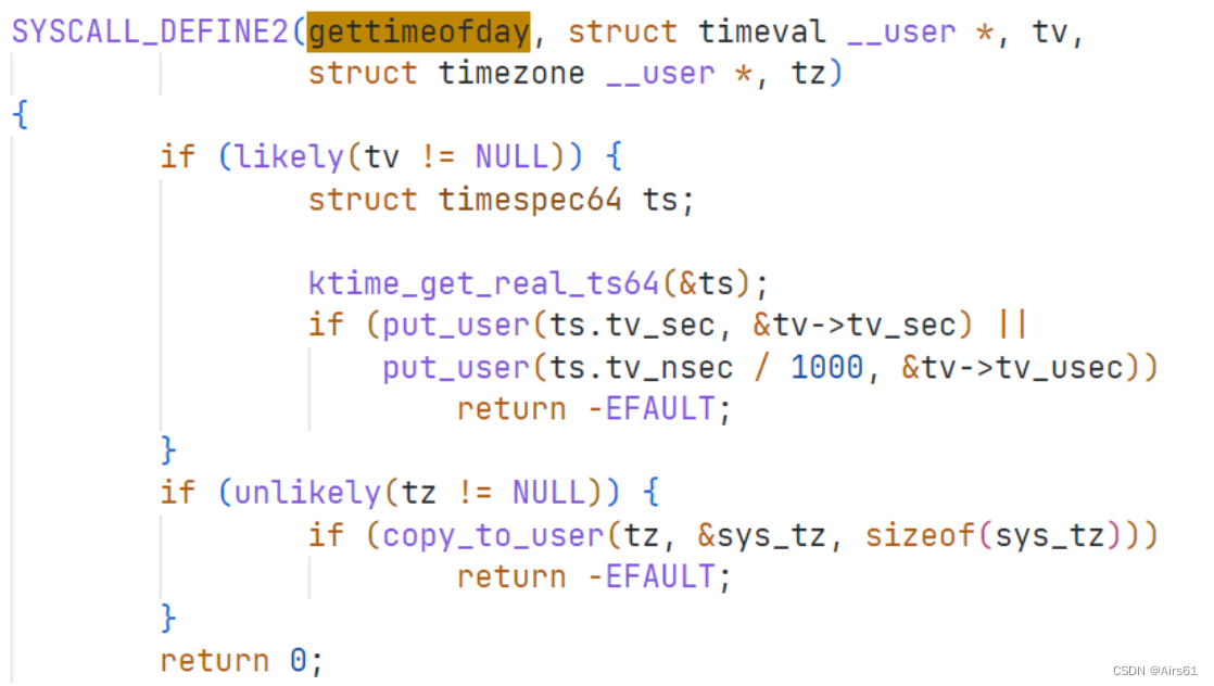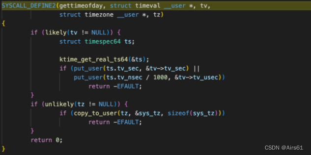 继续往下找可以找到 gettimeofday 系统调用的内核处理函数,代码如下: