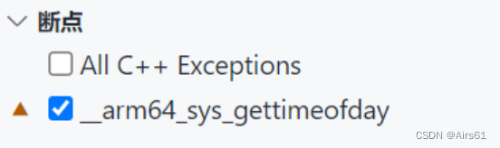 在 VSCode 中启动调试。首先在窗口左下角的断点设置处新增断点 __arm64_sys_gettimeofday(32 位 ARM 下是 sys_gettimeofday,注意不要搞错了),再在终端中执行 test。