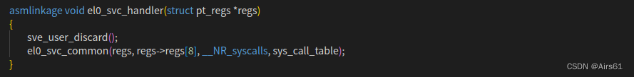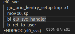 el0_sync:kernel_entry 0mrs x25, esr_el1 // read the syndrome registerlsr x24, x25, #ESR_ELx_EC_SHIFT // exception classcmp x24, #ESR_ELx_EC_SVC64 // SVC in 64-bit stateb.eq el0_svc...