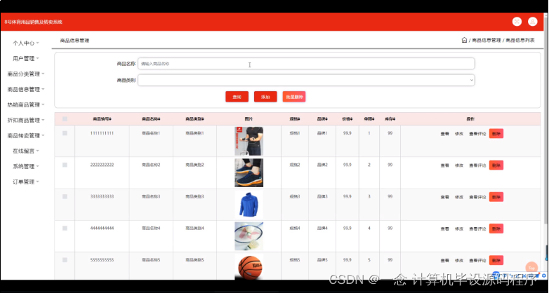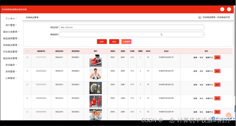 热销商品管理,在热销商品管理页面可以对商品编号,商品名称,商品类别,图片,规格,品牌,价格,单限,库存,地址等内容进行查看,修改,查看评论和删除等操作,如图5-9所示。