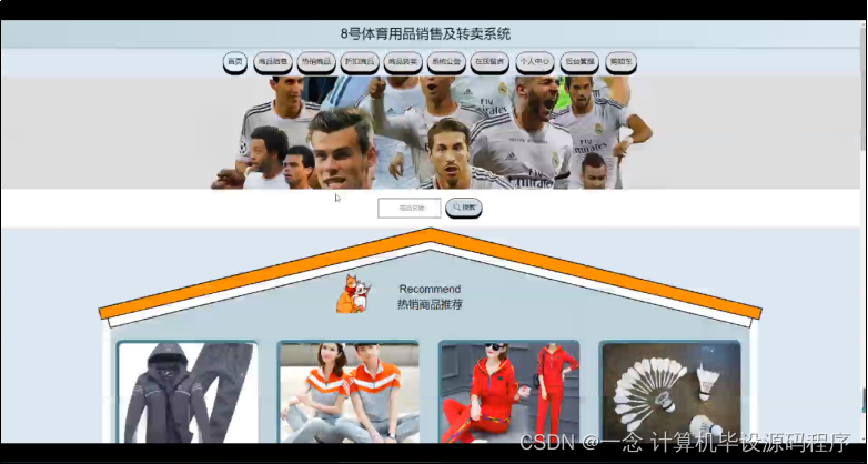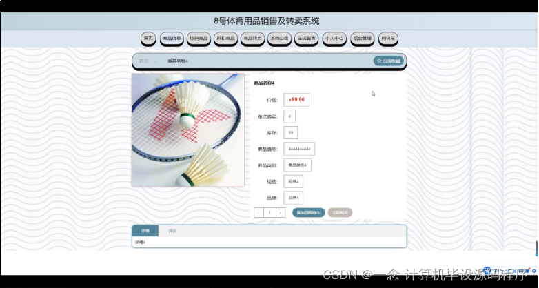 8号体育用品销售及转卖系统,在系统首页可以查看首页,商品信息,热销商品,折扣商品,商品转卖,系统公告,在线留言,个人中心,后台管理,购物车等内容,并进行详细操作;如图5-1所示。