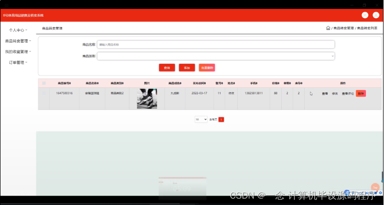 商品转卖管理,在商品转卖管理页面可以对商品编号,商品名称,商品类别,图片,商品成色,发布时间,账号,姓名,手机,价格,单限,库存等内容进行查看,修改,查看评论和删除等操作,如图5-13所示。