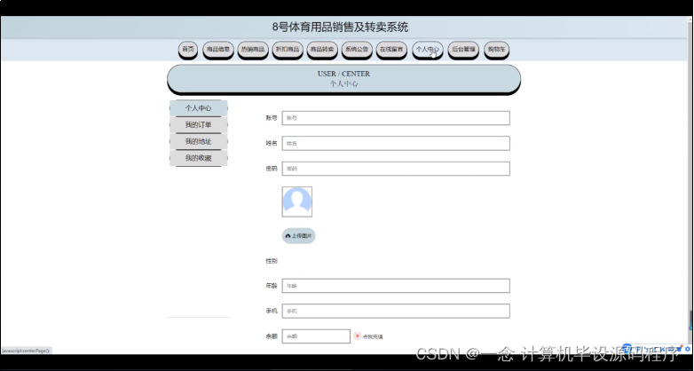 个人中心,在个人中心页面通过填写账号,姓名,密码,性别,年龄,手机,余额,会员等内容进行更新信息操作,还可以对我的订单,我的地址,我的收藏进行详细操作;如图5-4所示。