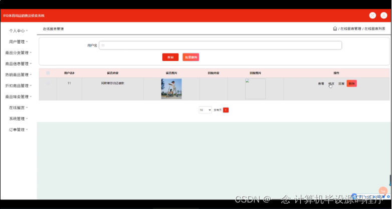在线留言管理,在在线留言管理页面可以对用户名,留言内容,留言图片,回复内容,回复图片等内容进行查看,修改,回复和删除等操作,如图5-10所示。