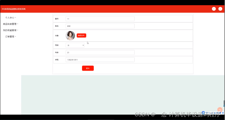 个人中心,在编辑个人中心页面通过填写账号,姓名,头像,性别,年龄,手机等内容并提交进行个人信息修改操作,如图5-12所示。