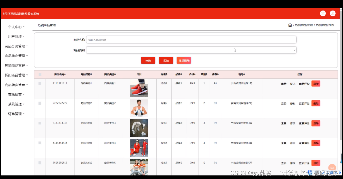 热销商品管理,在热销商品管理页面可以对商品编号,商品名称,商品类别,图片,规格,品牌,价格,单限,库存,地址等内容进行查看,修改,查看评论和删除等操作,如图5-9所示。