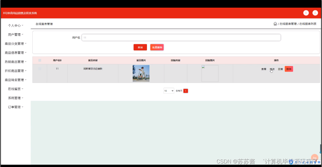 在线留言管理,在在线留言管理页面可以对用户名,留言内容,留言图片,回复内容,回复图片等内容进行查看,修改,回复和删除等操作,如图5-10所示。