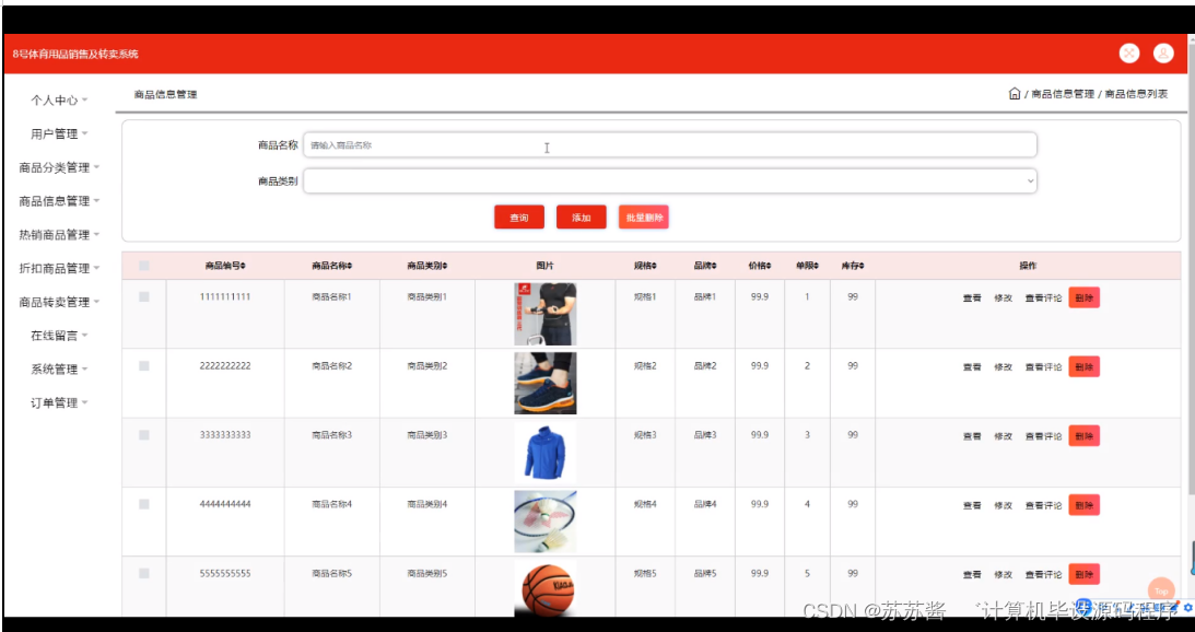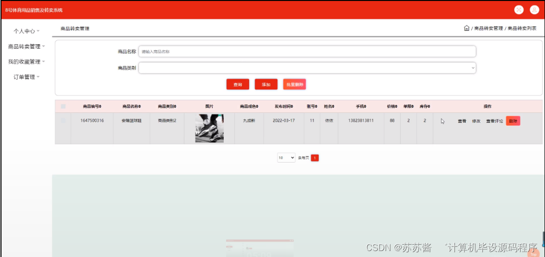 商品转卖管理,在商品转卖管理页面可以对商品编号,商品名称,商品类别,图片,商品成色,发布时间,账号,姓名,手机,价格,单限,库存等内容进行查看,修改,查看评论和删除等操作,如图5-13所示。