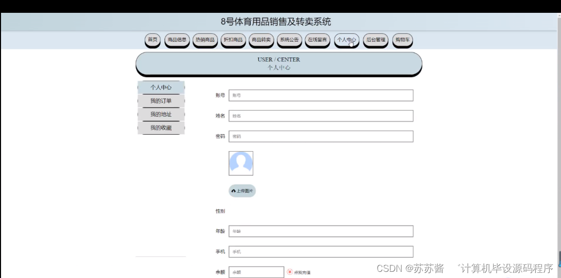 个人中心,在个人中心页面通过填写账号,姓名,密码,性别,年龄,手机,余额,会员等内容进行更新信息操作,还可以对我的订单,我的地址,我的收藏进行详细操作;如图5-4所示。