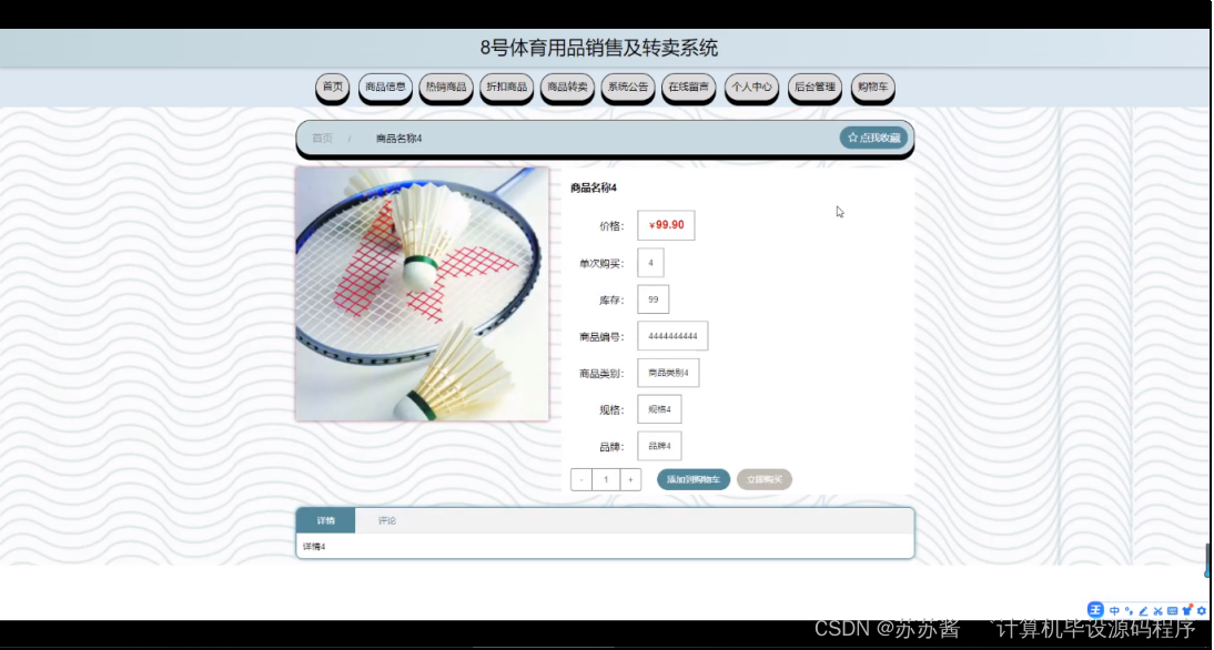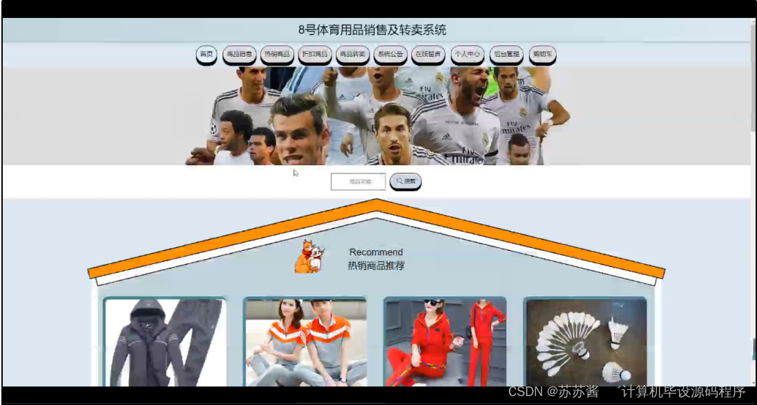 8号体育用品销售及转卖系统,在系统首页可以查看首页,商品信息,热销商品,折扣商品,商品转卖,系统公告,在线留言,个人中心,后台管理,购物车等内容,并进行详细操作;如图5-1所示。