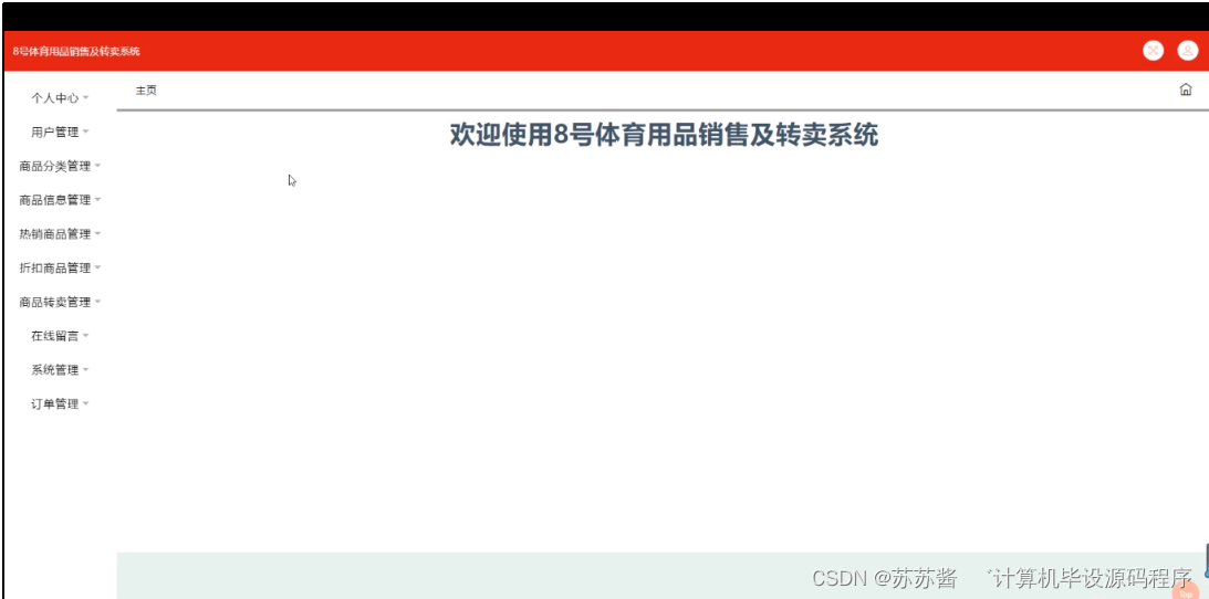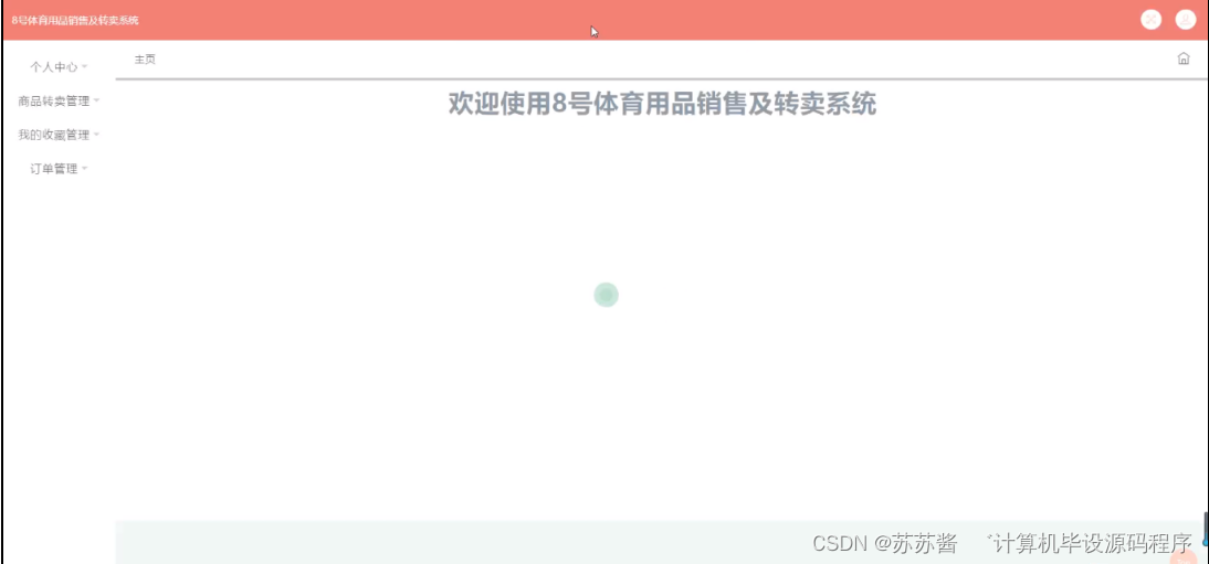 用户登录进入8号体育用品销售及转卖系统可以对主页,个人中心,商品转卖管理,我的收藏管理,订单管理等功能进行相应操作,如图5-11所示。