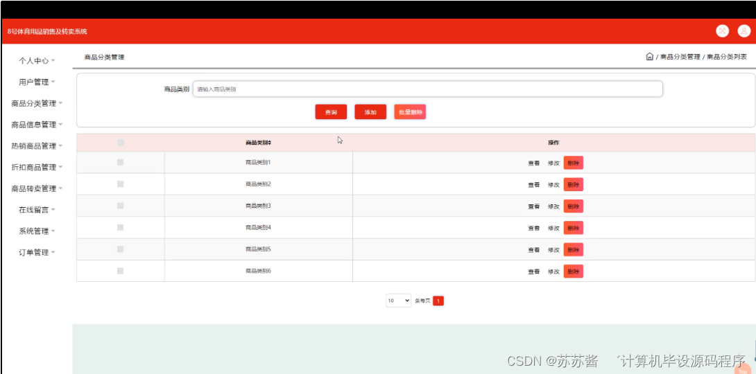 商品分类管理,在商品分类管理页面可以对商品分类进行查看,修改和删除等操作,如图5-7所示。