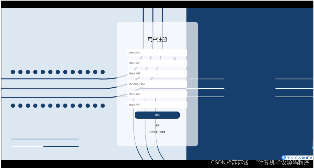 用户注册,在用户注册页面通过填写账号,姓名,密码,再次输入密码,年龄,手机等信息进行注册操作;如图5-2所示。