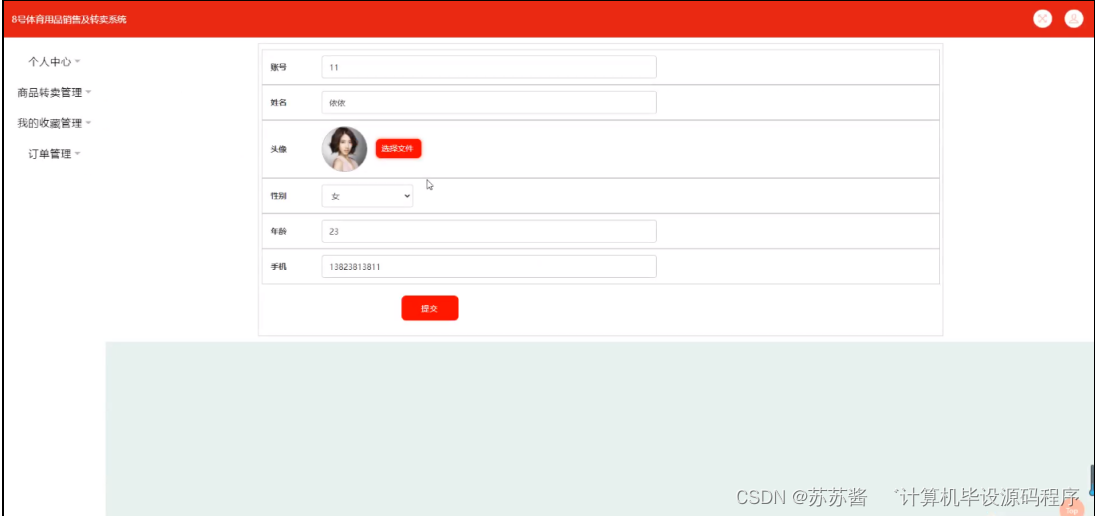 个人中心,在编辑个人中心页面通过填写账号,姓名,头像,性别,年龄,手机等内容并提交进行个人信息修改操作,如图5-12所示。