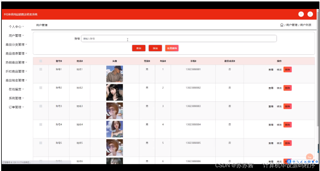 用户管理,在用户管理页面可以对账号,姓名,头像,性别,年龄,手机,是否会员等内容进行查看,修改和删除等操作,如图5-6所示。