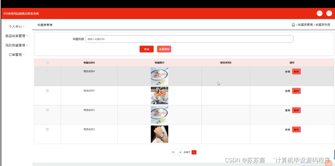 我的收藏管理,在我的收藏管理页面可以对收藏名称,收藏图片,推荐类型等内容进行查看和删除等操作,如图5-14所示。