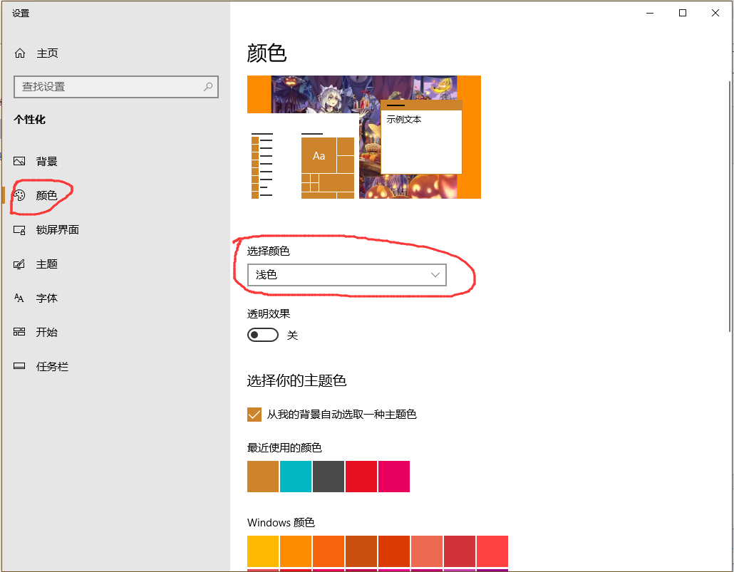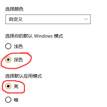 ③这里推荐选择“自定义”,并且将默认Windows模式和默认应用模式分别改成"深色"和“亮”(重点在于默认Windows模式,默认应用模式可随喜好选择)