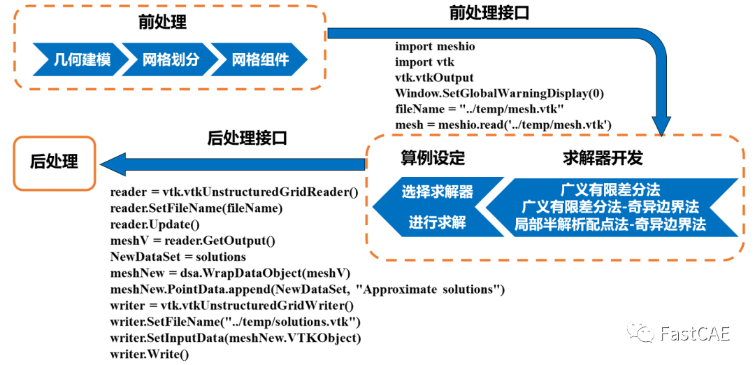 为了将本项目所开发的求解器与FastCAE平台结合,还需加入前后处理接口,前后处理接口通过Meshio和VTK库实现。