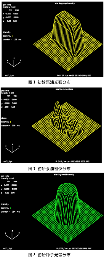 本例介绍了拉曼放大过程对应命令raman的使用。种子光初始时含有畸变,通过空间滤波器的清洁,种子光中的畸变就被虑除了。初始泵浦光的呈现平顶分布,拉曼放大过程中,泵浦光的中心部分由于放大过程而被消耗,因此放大后的泵浦中心出现凹陷,近似呈现为马鞍形分布。