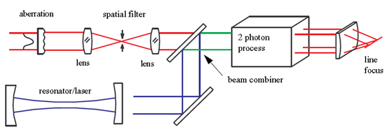 本例展示了更短波长的泵浦光对种子光进行拉曼放大的过程。泵浦光波长为1.06μm,种子光的波长是1.54μm。泵浦光和种子光都是带像差的。种子光穿过一个空间滤波器,使光束在一定程度上得到了净化。种子光和泵浦光合束后穿过一个拉曼放大器。放大器通过拉曼效应将泵浦光转化为种子光。放大后的种子光输出经过柱透镜聚焦成为一条焦线。上述拉曼放大过程的示意图如下所示: