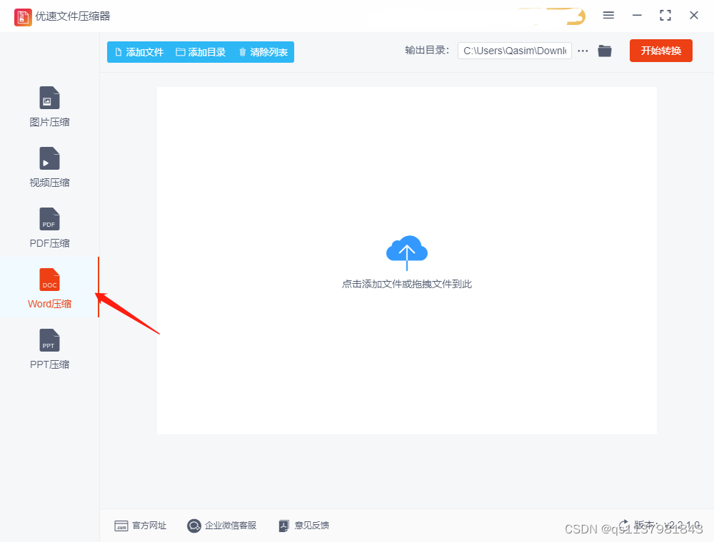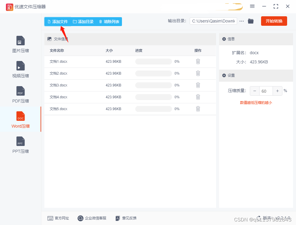 第二步:点击【添加文件】按钮,选择准备好要压缩的word文档,添加到软件中,软件支持批量上传文件,进行批量压缩处理。