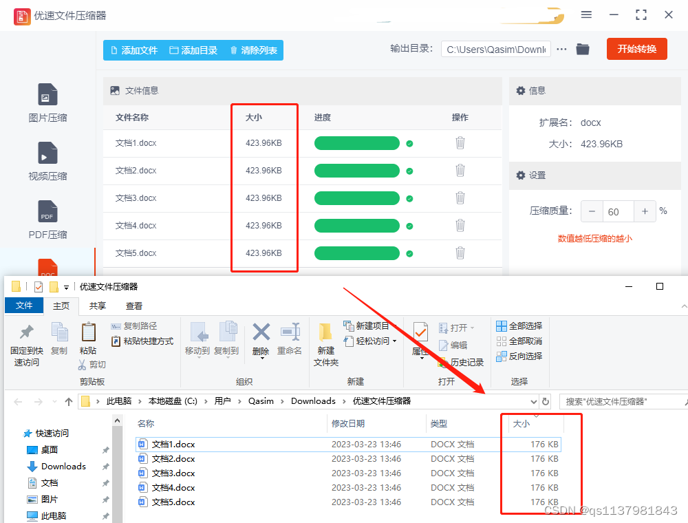 第五步:最后我们来验证压缩效果,如图所示,将压缩前后word文档大小进行对比,很明显可以看出压缩后的word文档比压缩前小了很多,说明压缩成功。