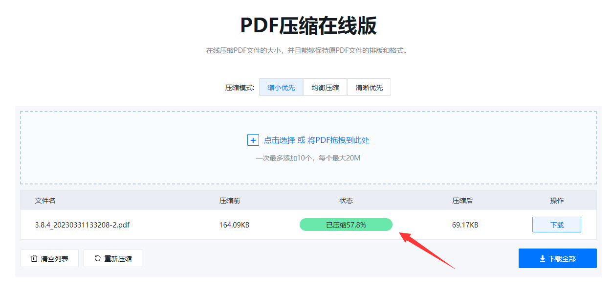 三、文件上传成功后,工具会自动进行压缩,提示已压缩,选择下载,即可直接使用。