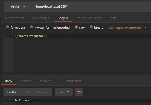 至此一个简单的 Http 服务器就完成了。首先我们来看看效果怎样,我们运行 HttpServer 中的 main 方法。让后使用 Postman 这个工具来测试下,使用 post 请求方式(也可以 get,但没有请求体),并一个 json 格式数据作为请求体发送给服务端,服务端返回给我们一个hello world字符串。