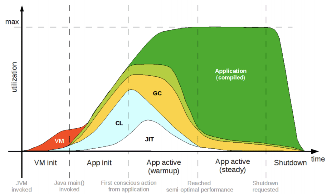 Java的启动时间也是一大心病,主要原因在于启动时虚拟机初始化和大量类加载的时间开销(当然还有一个罪魁祸首是Spring的bean初始化,我之前写了个异步初始化Spring Bean的starter rhino-boot-turbo,把串行改并行启动速度会快很多)。本身镜像体积大,拉取时间就长,再加上分钟级的启动时间,部署应用就更显得慢了。传统的企业应用更看重长时间运行的稳定性,重启和发布频率相对较低,对启动时间相对没那么敏感,然而对于需要快速迭代、水平扩展的微服务应用而言,更快的的启动速度就意味着更高的交付效率和更加快速的回滚。尤其是对于Serverless应用或函数,冷启动速度至关重要,之前看AWS Lambda函数允许最多运行5分钟,很难想象还要花一分钟时间先启动。