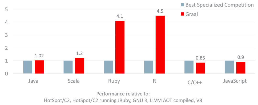 这是我找到的一份17年的性能数据,可以看到除了C/C++和JS之外,GraalVM的性能优势还是挺大的,尤其是对于Ruby、R这类解释型语言。