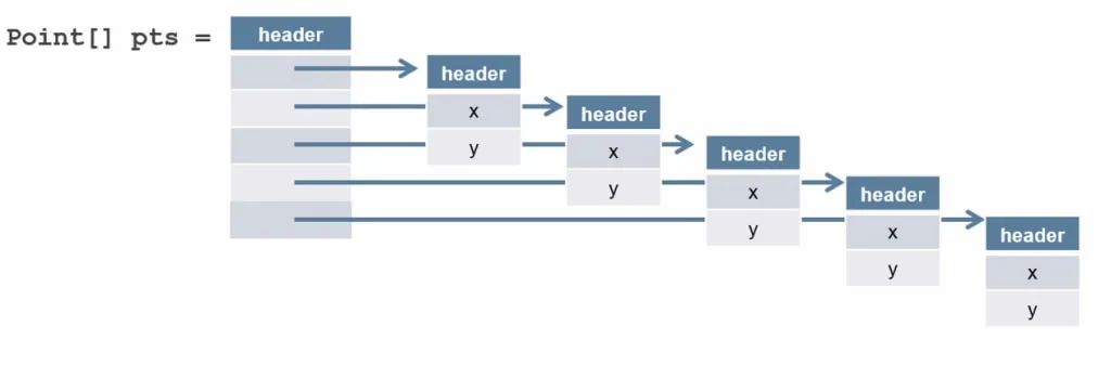 Java通过对象标识符进行链式访问,与之相对的是集中访问模式,例如C/C++中的struct会将对象在内存中拍平。两者的关键区别在于,链式访问需要读多次内存才能命中,而集中访问一次就可以将相关数据全部取出。打个比方,类A中包含类B,类B中包含类C,从A->B->C,链式访问在最坏情况下要读3次内存;而集中访问只需要读一次。