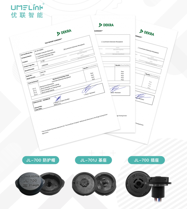 其中,L-701J Zhaga接口智能型锁扣式控制器基座,JL-700 Zhaga接口智能型锁扣式控制器插座,JL-700 Zhaga接口智能型锁扣式控制器插座防护帽这三款Zhaga接口产品更是在去年底荣获了德凯(DEKRA)质量检测认证证书。JL-701J Zhaga接口智能型锁扣式控制器基座在外形图、外径、机械止动性、密封面、接触度方面均通过了检测认证;JL-700 Zhaga接口智能型锁扣式控制器插座则在外形图、配合和接触制作、插拔转矩、接触度方面通过了检测认证,而JL-700 Zhaga接口智能型锁扣式控制器插座防护帽则通过了外形图、外径、机械止动性以及密封面的检测认证。