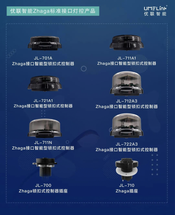 本次展会中,优联智能带来了由母公司朗骏智能(股票代码:837588)今年自主研发的JL-7系列Zhaga接口智能型锁扣式控制器。该系列是基于Zhaga接口的光控器系列产品——JL-7系列:JL-701A Zhaga接口智能型锁扣式控制器,JL-711A1 Zhaga接口智能型锁扣式控制器,JL-721A1 Zhaga接口智能型锁扣式控制器,JL-712A3 Zhaga接口智能型锁扣式控制器,JL-722A3 Zhaga接口智能型锁扣式控制器,JL-711N Zhaga接口智能型锁扣式控制器,JL-710 Zhaga插座,JL-700 Zhaga锁扣式控制器插座等。