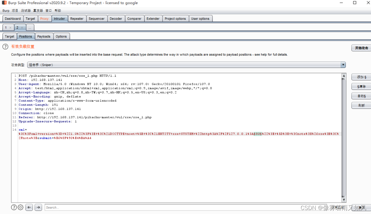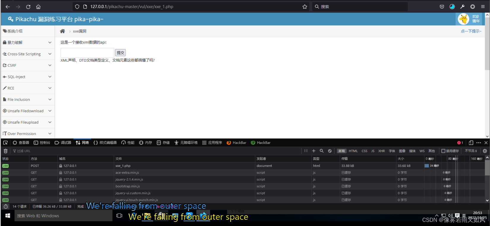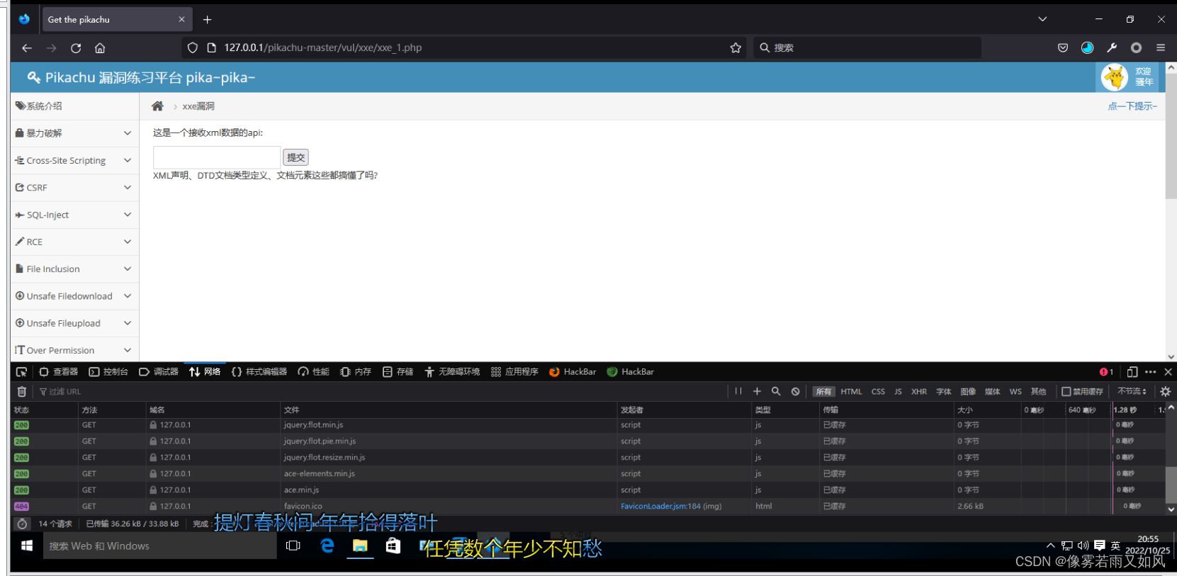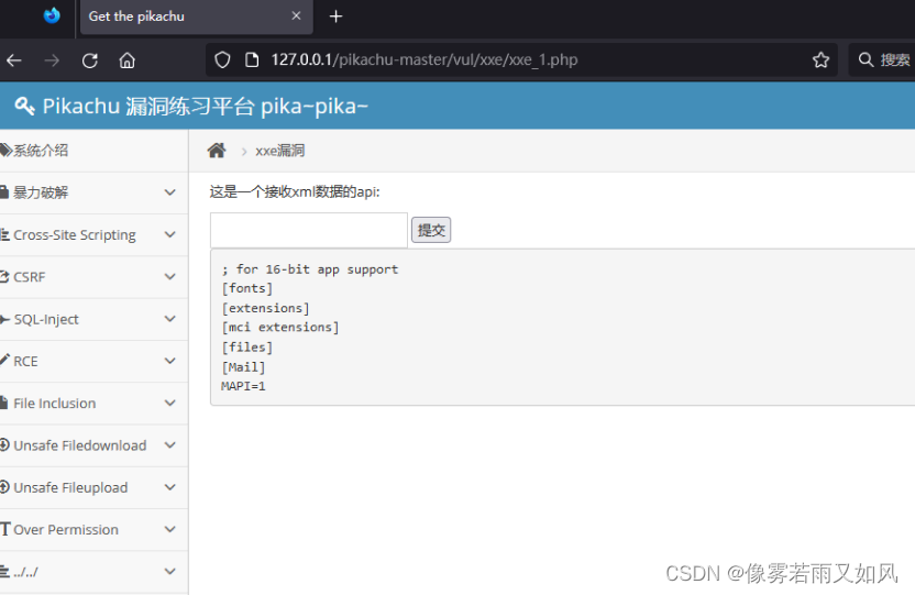 进入pikachu平台。进入XXE模块。点击XXE进入测试页面。