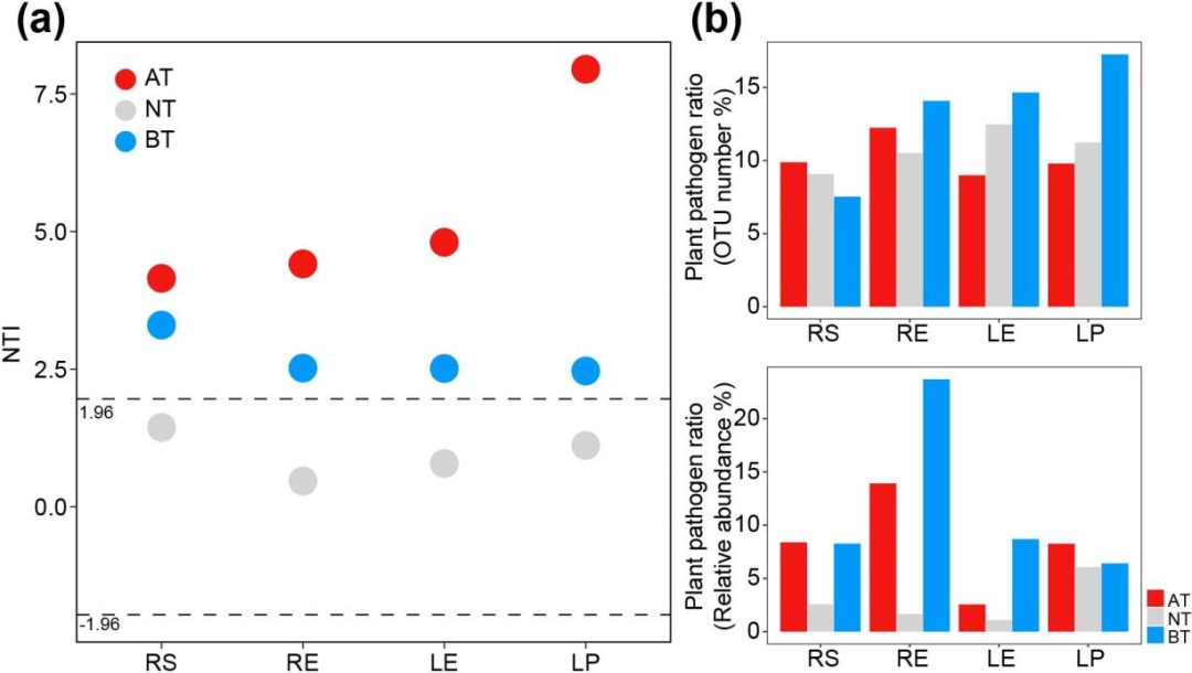 在中性模型 I 中,AT 可能被三种人参物种一致选择,而 BT 可能被人参属排斥,因此只能在某些物种的少数个体中或跨不同物种增殖。在中性模型 II 中,AT 倾向于被相应的宿主物种主动选择。中性模型 I 中的 AT 和 BT 表现出显著的系统发育聚类(NTI > 1.96),而 NT 在所有植物隔室中表现出系统发育随机分布(|NTI| < 1.96)(图 5a)。中性模型 I 叶内中的 BT,潜在植物病原体OTU数量和相对丰度都比其他两个隔室更高(图 5b)。
