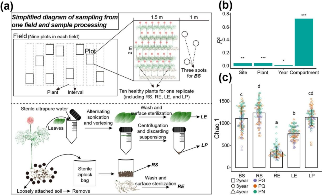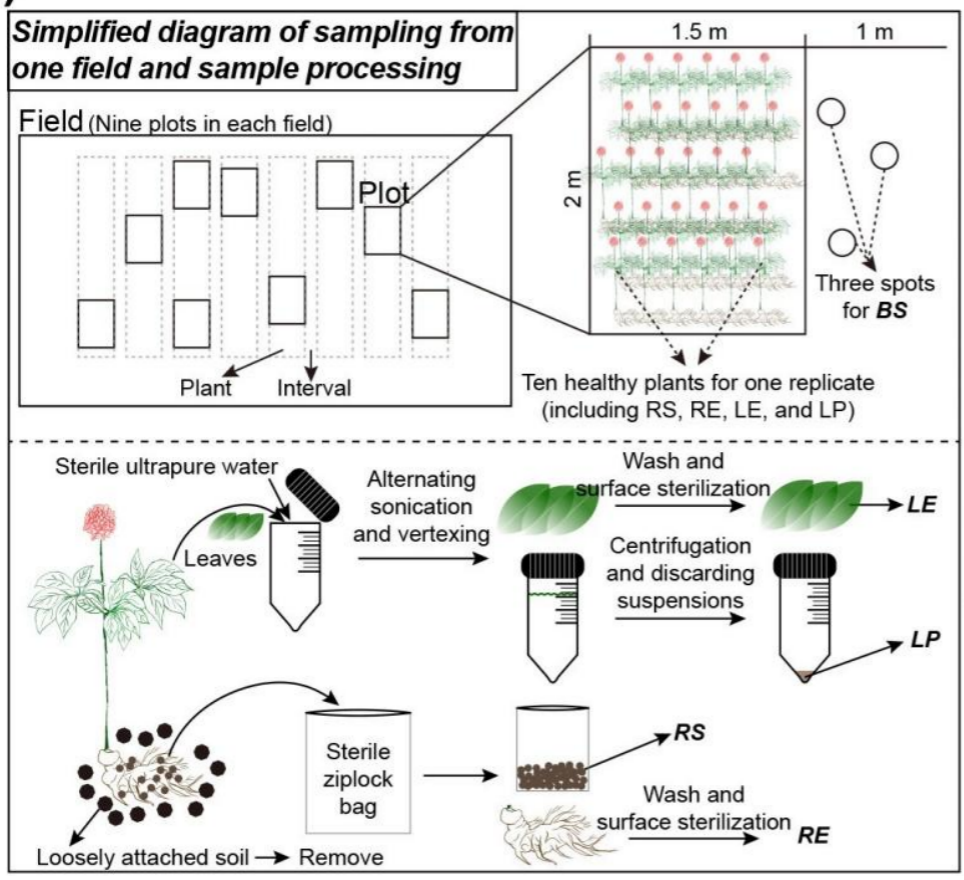 本研究在中国Panax ginseng (PG), P. quinquefolium (PQ), P. notoginseng (PN)核心产区进行大规模抽样,取生长2、3、4年的植株以供研究。从空白土壤(BS)、根际土壤(RS)、根内(RE)、叶内(LE)和叶表(LP)五个“隔室”(生态位)中采集了总共405个样本,开展ITS真菌高通量测序。