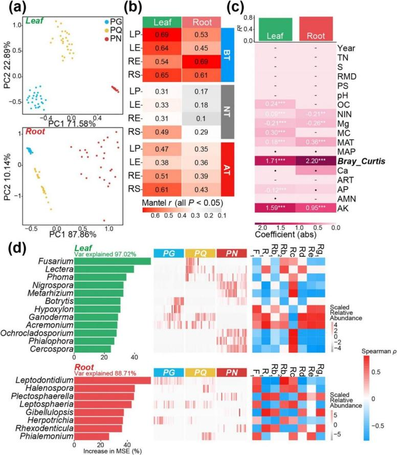三种人参物种中具有不同类型和含量的人参皂苷(图6a)。中性模型I中,LP 和 RE 的 BT 变化分别在预测叶和根的皂苷分布方面表现出最强的能力(图 6b ),使用属水平的真菌丰度作为解释变量进行随机森林回归分析,结果表明BT变化最能反映人参物种中皂苷的多样性。