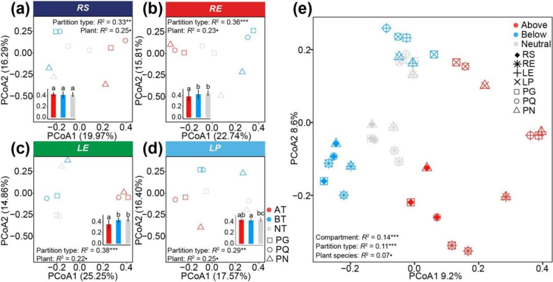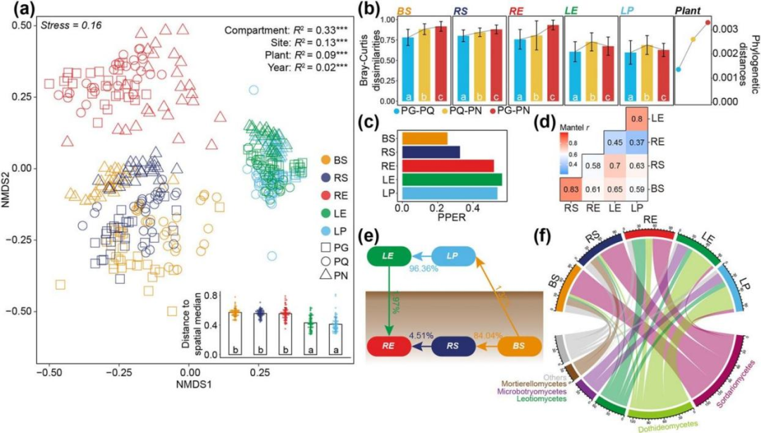 探索不同隔室中真菌群落的β多样性,地上隔室的真菌群落变化显著低于地下隔室,并且在三种植物物种中一样(图 2a)。分类群转移模型显示 LE 和 RS 中的菌群主要分别来自 LP 和 BS(图 2e)。地上隔室以 Dothideomycetes 为主,隔室主导了真菌群落的变异,不同隔室中的真菌群落在植物效应和变异模式方面存在差异。