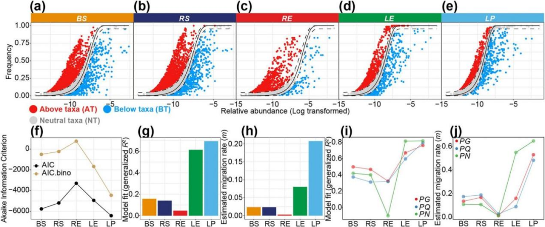 (AT:菌群丰度高于模型预测;BT:菌群丰度低于模型预测;NT:遵循中性模型分布)