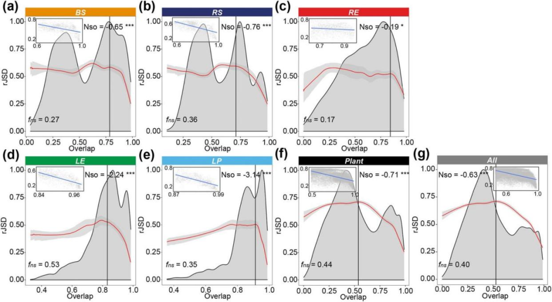 差异重叠曲线 (DOC)用于评估真菌群落的种群动态是否普遍。DOC 显示 rJSD 与在每个单独隔室的真菌群落、植物相关真菌群落和所有群落的高重叠值下的重叠之间存在明显的负相关性(图3),表明普遍动力学的存在。
