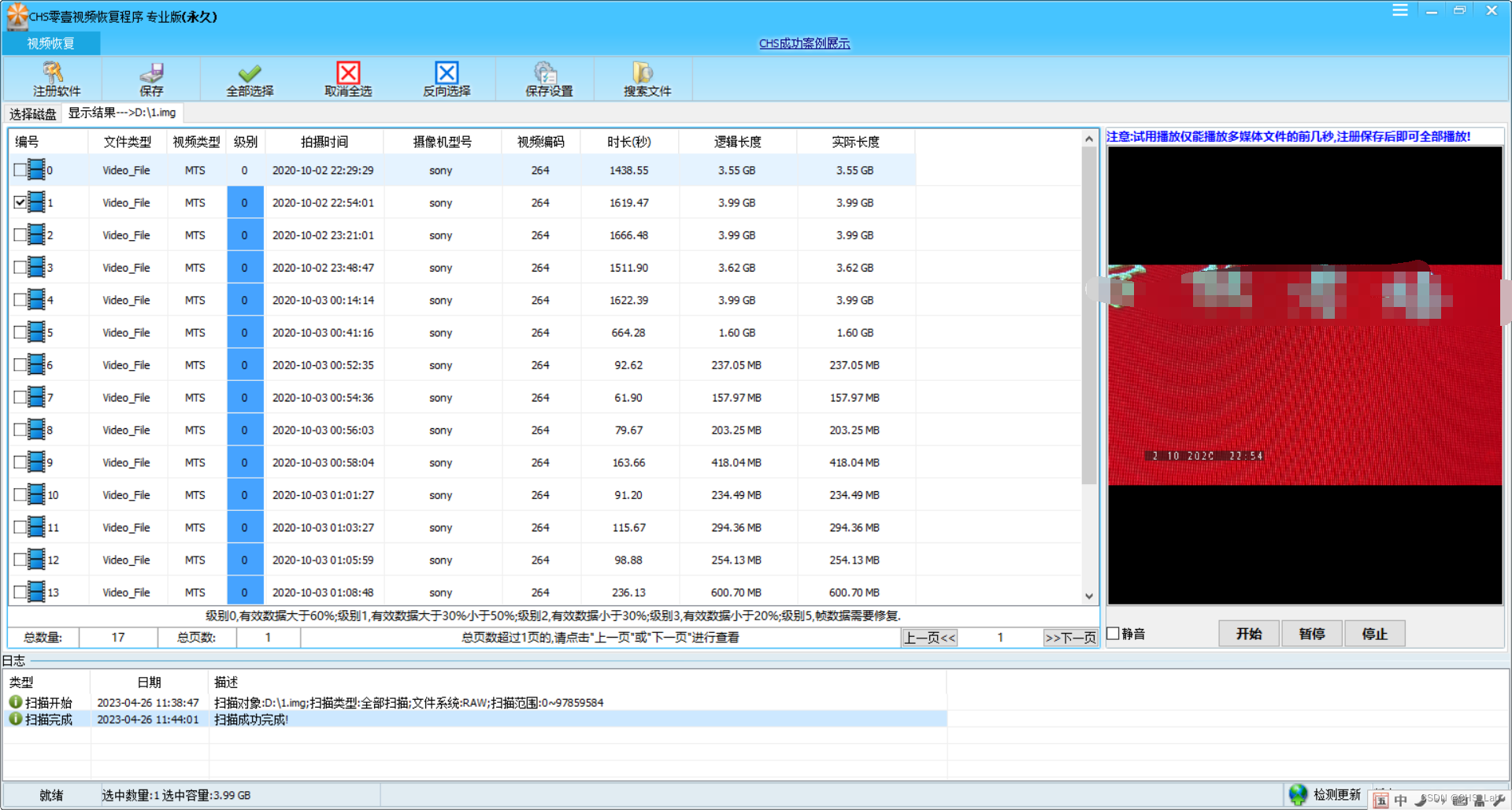 STEP3:查看恢复结果。可以看到程序列出了拍摄时间、编码、时长、级别等参数,其中级别为0代表恢复效果很好;点击文件右侧预览可以试用播放。