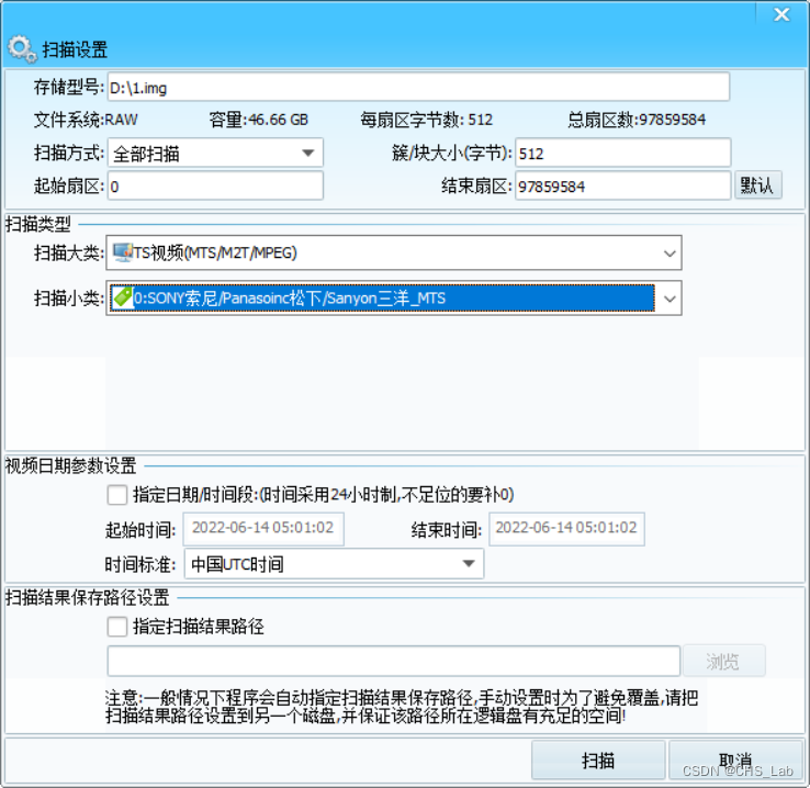 STEP1:运行 CHS零壹视频恢复程序专业版,点击”扫描”切换到扫描设置界面,扫描大类选择->”TS视频(MTS/M2T/MPEG)”,扫描小类选择->“0:SONY索尼/Panasoinc松下/Sanyon三洋_MTS”然后点击确定进行扫描。