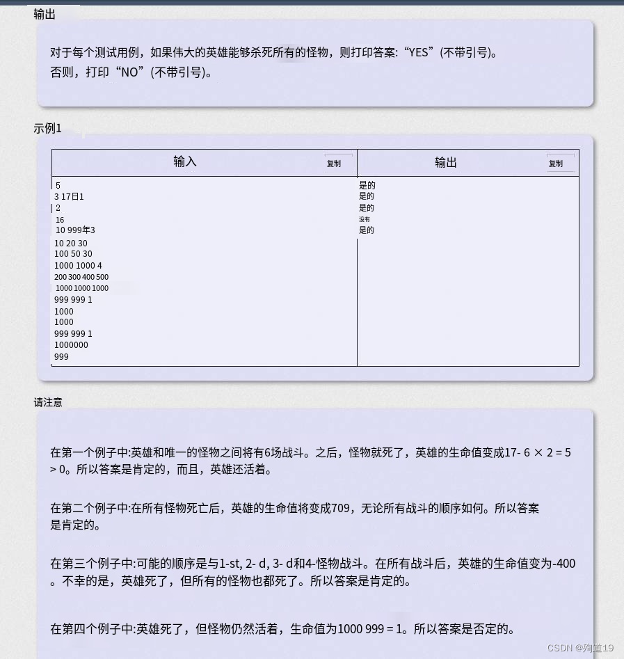 首先,将伤害最高的怪放到最后打(记作boss),之后,对每个怪物进行单独处理(如果不能刚好将其消灭,则需要在记录攻击次数时+1),需要特别注意的是,英雄可能和怪物同归于尽,则需要把此类情况考虑进来(最后还是超时了)