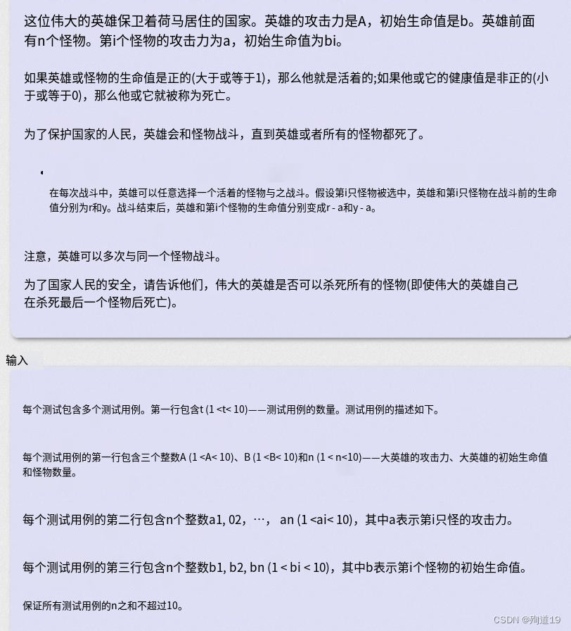 {cin>>n;for(long long int j=0;j>DPS>>HP>>m;boss=0;for(long long int i=0;i>guai[i].dps;boss=max(boss,guai[i].dps);}for(long long int i=0;i>guai[i].hp;}for(long long int i=0;i