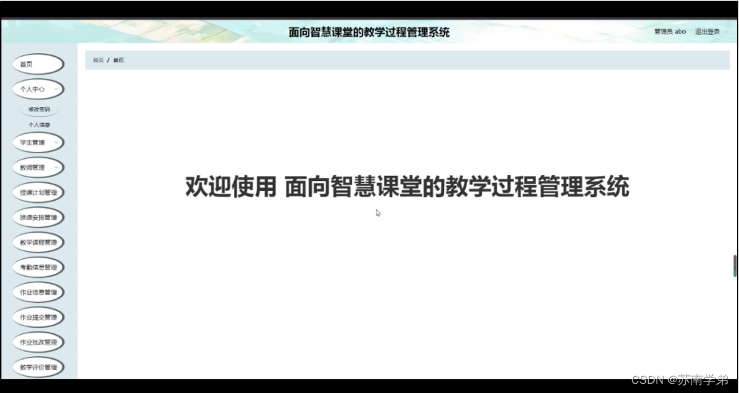 管理员登录系统后,可以对首页,个人中心,学生管理,教师管理,授课计划管理,换课安排管理,教学课程管理,考勤信息管理,作业信息管理,作业提交管理,作业批改管理,教学评价管理等功能进行相应的操作管理,如图5-3所示。
